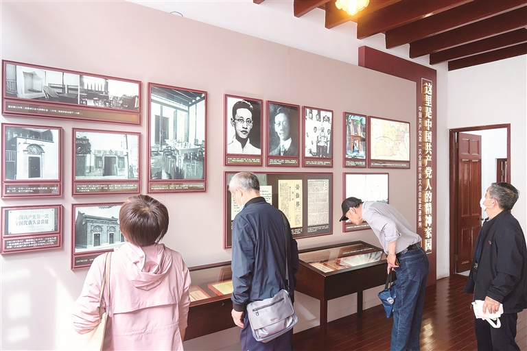 图为4月18日,党员干部群众在中共一大纪念馆内参观中国共产党人伟大精神文物史料专题展。