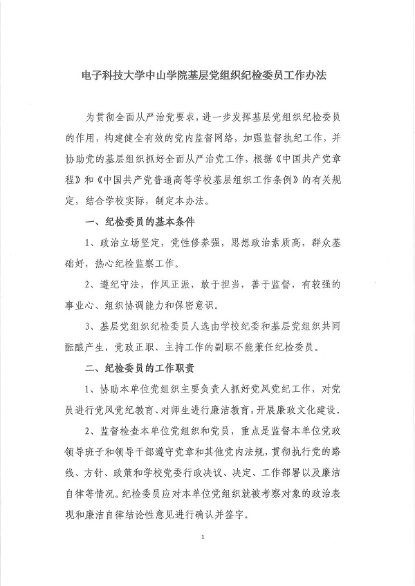 电子科技大学中山学院基层党组织纪检委员工作办法